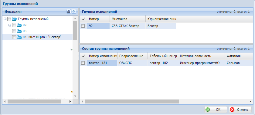 Создайте или выберите группу исполнений. В неё включите сотрудника, по которому формируется отчет.