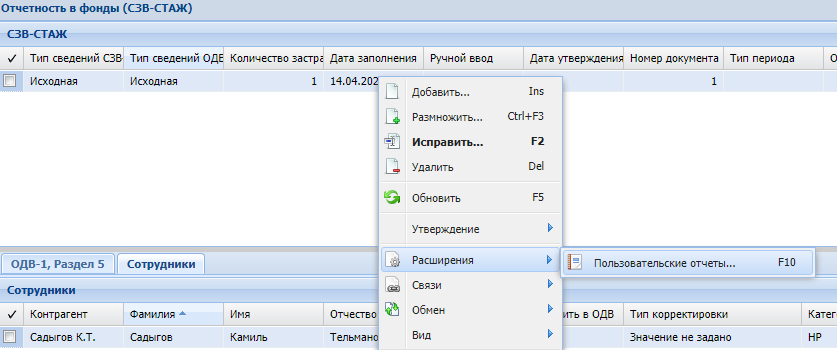 Через действие "СЗВ-СТАЖ" отчеты отрываются для просмотра и редактирования.