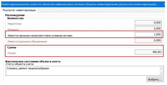 в спецификации «Результаты инвентаризации» значения в атрибутах «Сумма» и «Имеются признаки несоответствия условиям актива» > 0:
