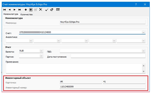 Неинвентарного – путем выбора из словаря «Номенклатор»: