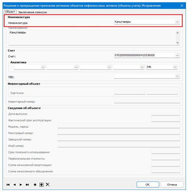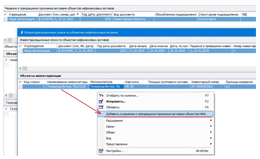 Инвентарного Решения о прекращении признания активами объектов нефинансовых активов объекты добавляются путем выбора из