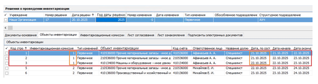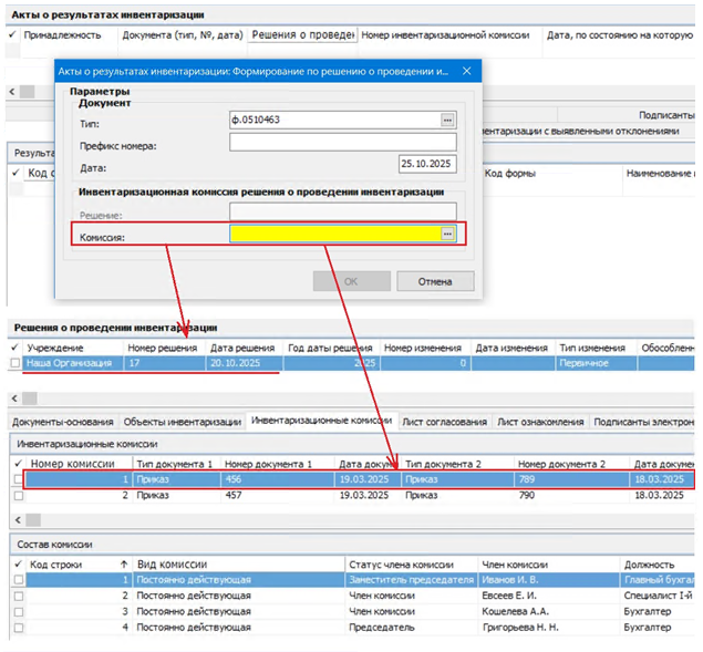 инвентаризационная комиссия, выбранная в параметрах формирования