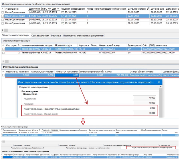 - записи в спецификации «Результаты выявленных качественных характеристик» формируются на основании Инвентаризационных описей по объектам нефинансовых активов, по объектам инвентаризации которых в результате проведения инвентаризации были выявлены отклонения качественных характеристик, т.е. по тем Инвентаризационным описям, в которых хотя бы у одной записи спецификации «Объекты инвентаризации» существует хотя бы одна строка в дочерней спецификации «Результаты инвентаризации», в которой значение одного из полей «Имеются признаки несоответствия условиям актива» или «Имеются признаки обесценения» > 0: