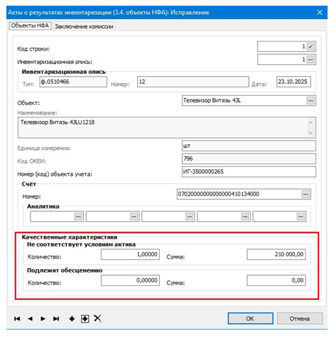 в спецификации «Результаты выявленных качественных характеристик» заполняется информация об инвентаризационных описях, по объектам которых в результате проведения инвентаризации были выявлены отклонения качественных характеристик.