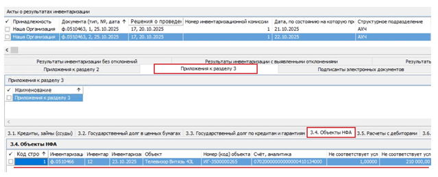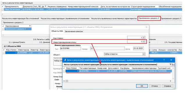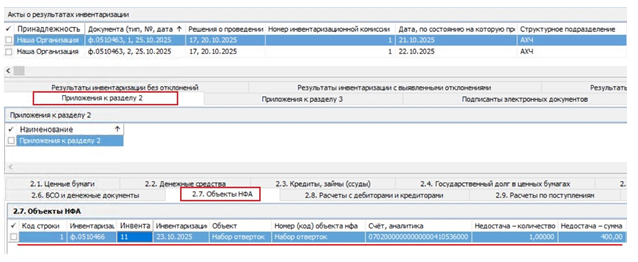 При формировании сведений в спецификации «Результаты инвентаризации с выявленными отклонениями» также происходит автоматическое добавление записи в спецификации «Приложения к разделу 2» и сведений в её дочерней спецификации «2.7. Объекты НФА»: