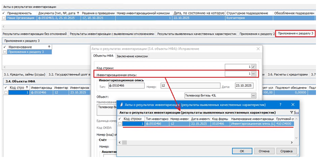 первой вкладки пользователю необходимо выбрать инвентаризационную опись из спецификации «Результаты выявленных качественных характеристик» документа: