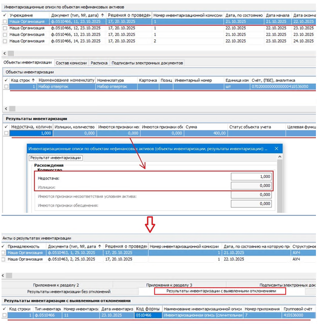 - записи в спецификации «Результаты инвентаризации с выявленными отклонениями» формируются на основании Инвентаризационных описей по объектам нефинансовых активов, по объектам инвентаризации которых в результате проведения инвентаризации были выявлены количественные или суммовые отклонения, т.е. по тем Инвентаризационным описям, в которых хотя бы у одной записи спецификации «Объекты инвентаризации» существует хотя бы одна строка в дочерней спецификации «Результаты инвентаризации», в которой значение одного из полей «Недостача» или «Излишки» > 0: