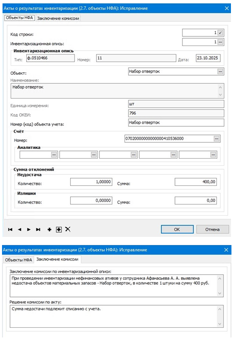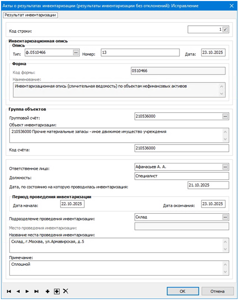 первой вкладки пользователю необходимо выбрать инвентаризационную опись из спецификации «Результаты инвентаризации с выявленными отклонениями»: