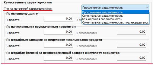 тип качественной характеристики путем выбора значения из выпадающего списка, как, например, при заполнении спецификации «3.1. Кредиты, займы (ссуды)»: