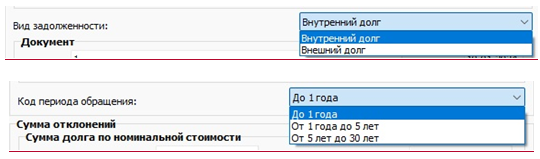 - при заполнении информации о выявленных отклонениях на счетах учета состояния государственного долга Российской Федерации в ценных бумагах указывается вид задолженности и код периода обращения путем выбора из предопределенных списков: