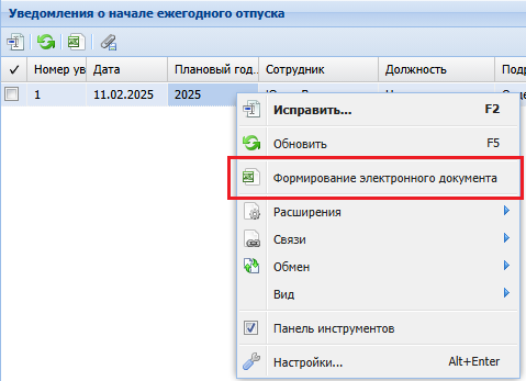 Сформировать электронный документ, нажав на записи уведомления правой кнопкой мыши и выбрать "Формирование электронного документа".