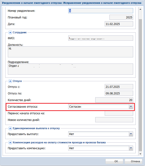 Выбрать значение в списке выбора "Согласование отпуска", указать требуется или нет единовременная выплата к отпуску и компенсация расходов оплаты проезда (льготный отпуск). Если выбрано "Не согласен, перенос" в согласовании отпуска, то надо указать новую дату начала отпуска и (или) новое количество дней отпуска.