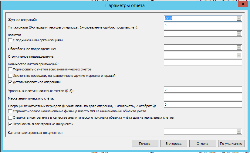 Если в параметре печати «Тип журнала» указать значение «1», то для формирования отчета будут отобраны только операции по