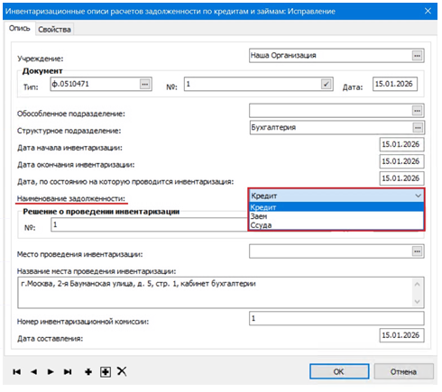 При добавлении Инвентаризационной описи в заголовке заполняются общие сведения о документе, а также указывается наименование задолженности – «Кредит», «Заем» или «Ссуда»: