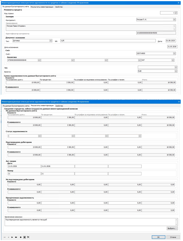 Документ формируется ответственным исполнителем бухгалтерской службы в разделе Документы ⇒ Инвентаризация ⇒ Инвентаризационные описи задолженности по кредитам и займам.