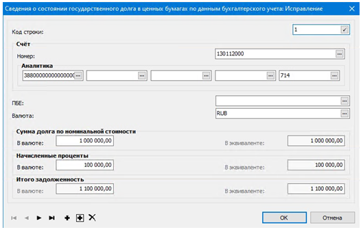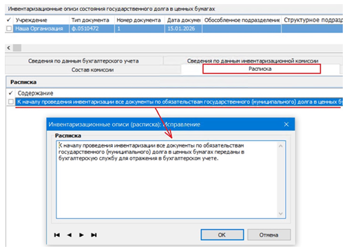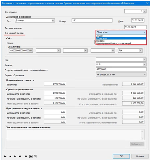 Документ формируется ответственным исполнителем бухгалтерской службы в разделе Документы ⇒ Инвентаризация ⇒ Инвентаризационные описи состояния государственного долга в ценных бумагах.