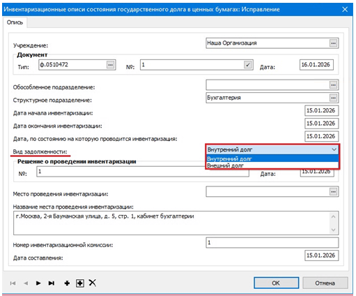 При добавлении Инвентаризационной описи в заголовке заполняются общие сведения о документе, а также указывается вид задолженности – «Внутренний долг» или «Внешний долг»:
