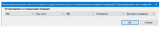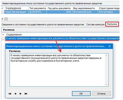 Для печати документа с целью формирования ЭД применяется пользовательский отчет «Инвентаризационная опись состояния государственного долга по привлеченным кредитам, ф.0510473».