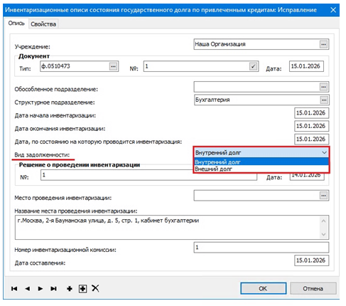 При добавлении Инвентаризационной описи в заголовке заполняются общие сведения о документе, а также указывается вид задолженности – «Внутренний долг» или «Внешний долг»: