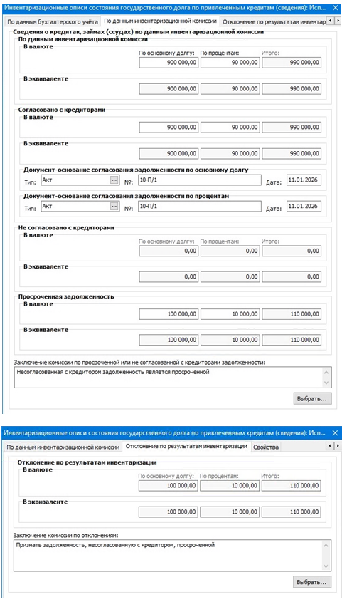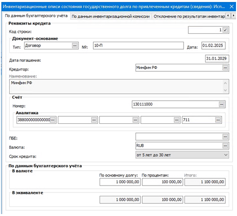 Документ формируется ответственным исполнителем бухгалтерской службы в разделе Документы ⇒ Инвентаризация ⇒ Инвентаризационные описи состояния государственного долга по привлеченным кредитам.