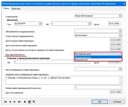 При добавлении Инвентаризационной описи в заголовке заполняются общие сведения о документе, а также указывается вид задолженности – «Внутренний долг» или «Внешний долг»: