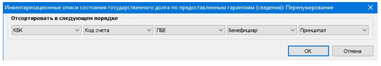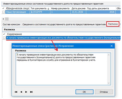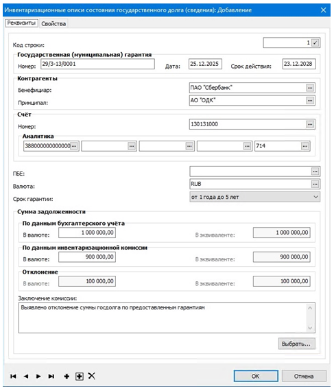 Документ формируется ответственным исполнителем бухгалтерской службы в разделе Документы ⇒ Инвентаризация ⇒ Инвентаризационные описи состояния государственного долга по предоставленным гарантиям.