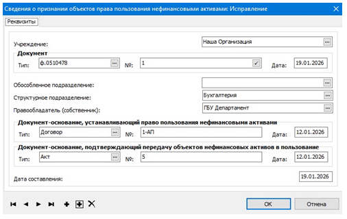 Документ формируется ответственным исполнителем субъекта учета в разделе Документы ⇒ Электронные документы и регистры ⇒ Сведения о признании объектов права пользования нефинансовыми активами.