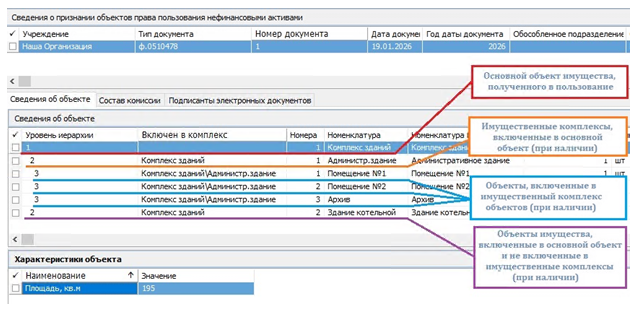 В случае, когда в состав объекта имущества, полученного в пользование, включены объекты, не включенные в имущественные комплексы, пользователю необходимо сначала также добавить запись спецификации со сведениями о заключенном договоре на основной объект имущества, полученного в пользование, а затем добавить к нему объекты, не включенные в имущественные комплексы.
